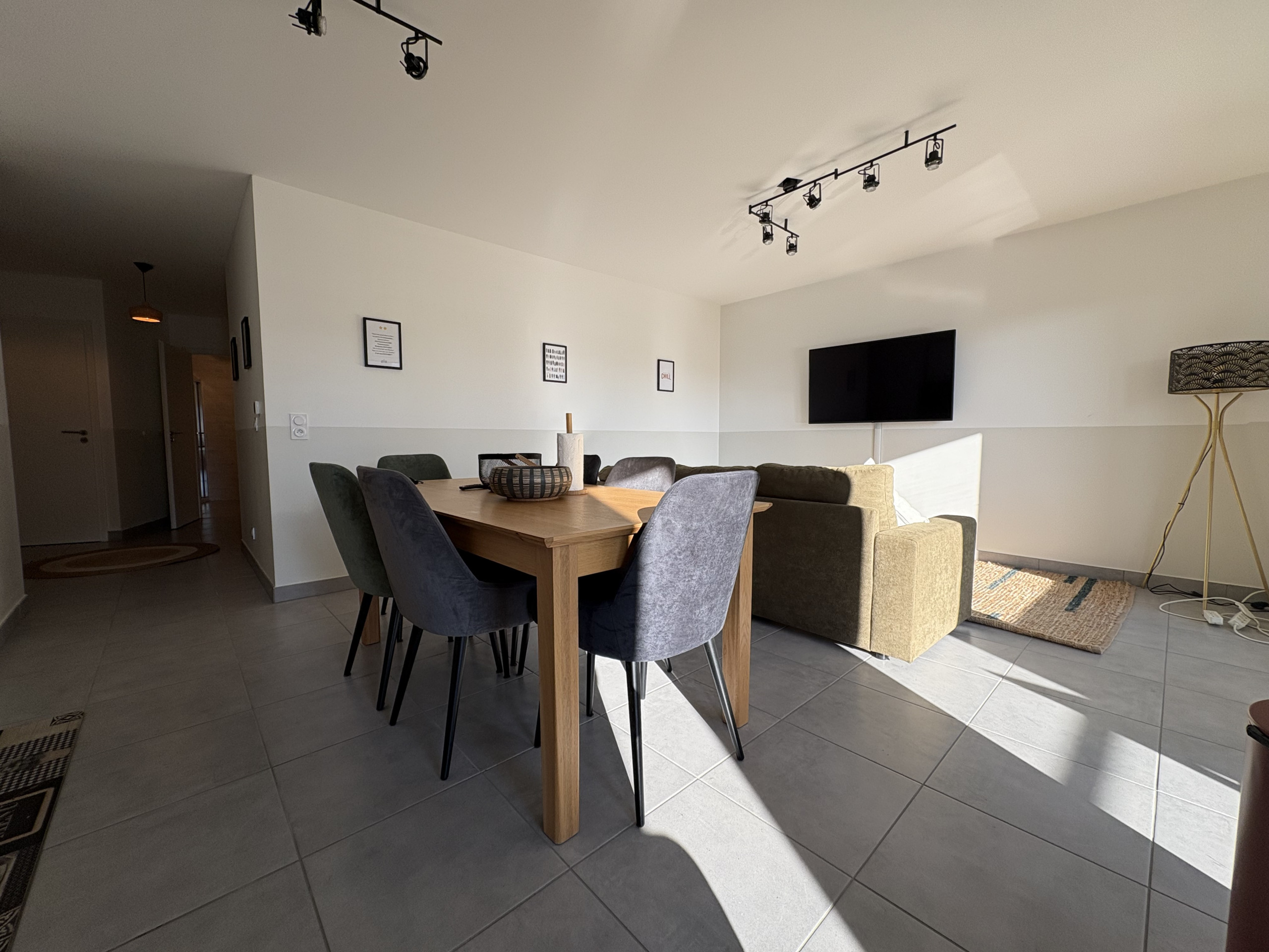 The open-plan kitchen is fully equipped with an induction hob, fridge, oven, washing machine and dishwasher to prepare delicious meals. Each bedroom and the living room are equipped with connected televisions for your entertainment.